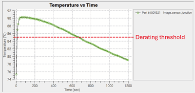 The second case study focuses on the ADAS camera mounted near the windshield, where it is exposed to solar radiation, elevated ambient temperatures, and limited airflow. Transient simulation was used to evaluate how the camera housing and internal components responded to these conditions over time. The performance and derating behavior of two different CMOS image sensors were compared.