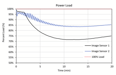 Both image sensors experienced derating due to high temperatures, but the second image sensor maintained a power draw closer to its typical 100% power load, performing better than the first image sensor because of its larger operating temperature range and lower typical power consumption.